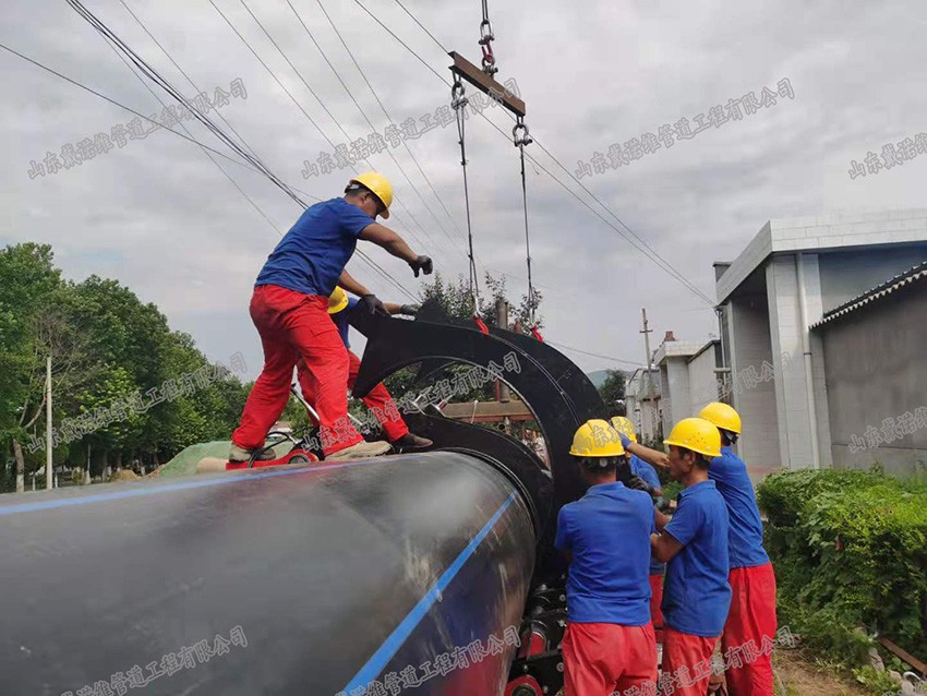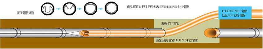 管道內(nèi)襯PE管修復(fù)是將外徑等于或略小于待修復(fù)管道內(nèi)徑的HDPE襯管,通過專用壓U設(shè)備,截面被壓變成雙層U形。在牽引力的作用下穿入待修復(fù)管道內(nèi)部。穿插到位后,利用壓力打開管腔,使之恢復(fù)成圓形,與外管道內(nèi)壁貼合,形成牢靠的復(fù)合管。