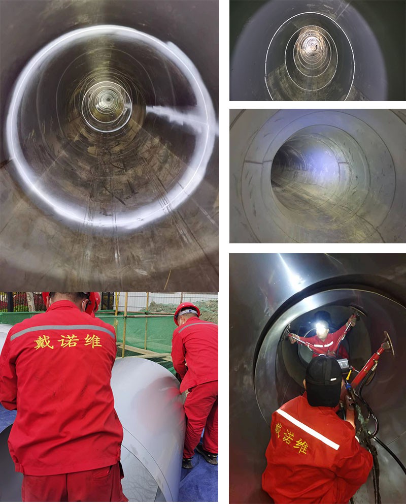 管道內(nèi)襯不銹鋼工藝是在舊管道內(nèi)部穿插內(nèi)襯薄壁不銹鋼管,或?qū)⒉讳P鋼板采用卷板形式在管道內(nèi)部進行焊接,整體成型,形成原鋼管與不銹鋼內(nèi)襯管相結(jié)合的“管中管”結(jié)構(gòu)。從而達到提高承壓、耐腐蝕、延長原管道使用壽命的修復目的。