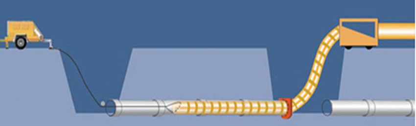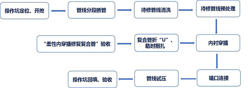 內(nèi)襯復(fù)合軟管的修復(fù)工藝是將外徑等于或略小于舊管道內(nèi)徑的復(fù)合管,通過變形設(shè)備將柔性復(fù)合管軋成“U”型并暫時(shí)捆綁使其直徑減小,通過牽引機(jī)將柔性復(fù)合管穿入舊管道,然后用水或壓縮空氣將其漲開恢復(fù)到原來的直徑,使內(nèi)襯管貼到舊管道的內(nèi)壁上,形成合二為一的“管中管”復(fù)合結(jié)構(gòu)。
